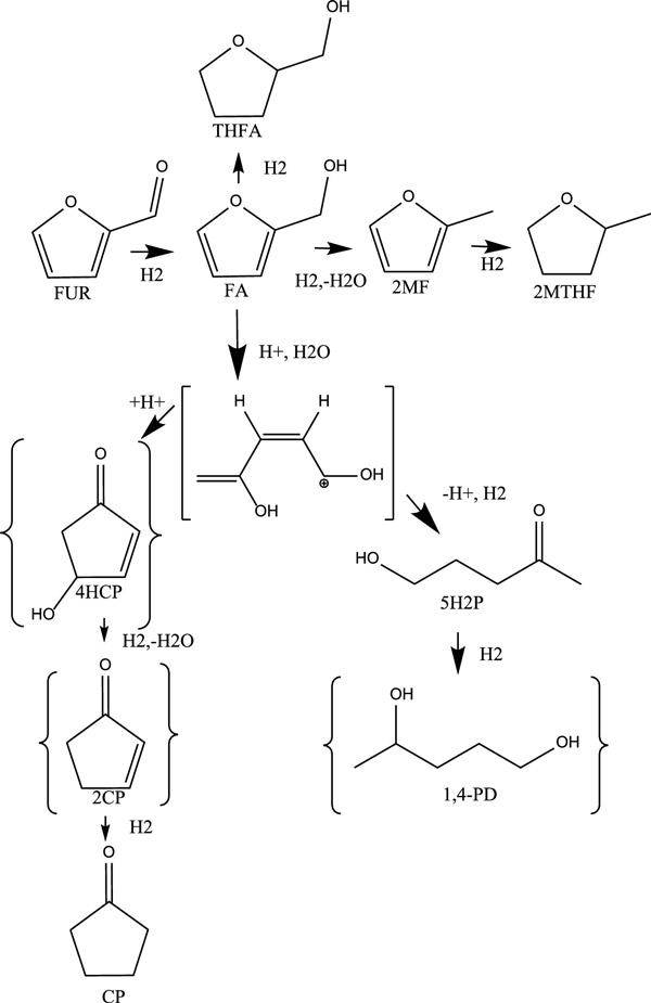 在下一組實驗中,確定了液體停留時間對糠醛加氫超過0.8%活性炭催化劑的影響(H 2氣流保持恒定在100 mL/min)。糠醛轉(zhuǎn)化率隨著液時空速的增加或停留時間的縮短而下降,碳封閉率在74%至100%之間。溫度,壓力和液體停留時間效應(yīng)研究的結(jié)果表明,活性炭催化劑主要通過糠醛促進了糠醛中糠醇和2-甲基呋喃的形成,并通過推測性反應(yīng)途徑促進了環(huán)戊酮和5-羥基-2-戊酮的少量形成,需要對酮進行酸催化)形成(圖3)。