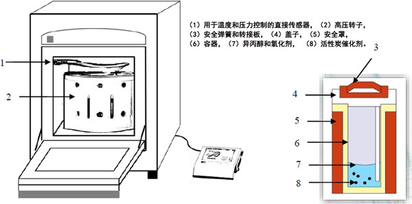 圖1是實驗室設(shè)置的示意圖。微波消解實驗站用于產(chǎn)生微波能量。在標(biāo)準(zhǔn)反應(yīng)運(yùn)行中,將10 mL異丙醇溶液轉(zhuǎn)移到100 mL鐵氟龍容器中。在攪拌下將所需體積的過氧化氫溶液(30%)注入到容器中。然后,將一定量的活性炭催化劑添加到該異丙醇溶液中,并在微波消解實驗室站中照射120秒。在所有實驗中,溶液溫度均保持在80±2°C,MW功率保持在600W。