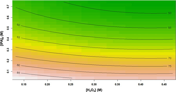 圖2顯示了總有機(jī)碳去除效率百分?jǐn)?shù)與H 2 O 2濃度和初始異丙醇濃度的關(guān)系。從響應(yīng)輪廓中可以看出,將異丙醇初始濃度從0.038 M增加到0.743 M,導(dǎo)致TOC去除率從85.17%急劇降低到46.29%?赡苁且驗樵谙嗤膽(yīng)用反應(yīng)條件下,自由基(OH•)的數(shù)量保持恒定,而初始異丙醇濃度卻增加了。換句話說,相對較少量的氧化基團(tuán)可用于攻擊異丙醇分子。類似地,總有機(jī)碳降解性能也隨著H 2 O 2濃度的增加而逐漸降低。過量的H 2 O 2可能促進(jìn)自動清除反應(yīng)的發(fā)生。