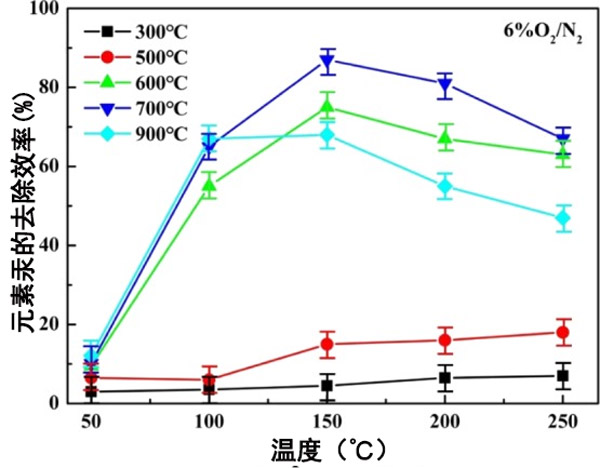 對于活性炭吸附煙氣中的元素汞。除汞測試表明,熱解溫度為700°C時,活性炭的除汞效率為86%。氧氣的存在促進了元素汞的去除。當(dāng)熱解溫度升至900°C時,活性炭趨于團聚,導(dǎo)致結(jié)晶相粒徑急劇增加,從而抑制了元素汞的去除。但在更高的熱解溫度下會增加;钚蕴康腂ET表面非常差,當(dāng)熱解溫度不高于500°C時,幾乎不會產(chǎn)生鈷元素,導(dǎo)致除汞效率低。無論如何,活性炭可以用于吸附去除元素汞,而不是通過化學(xué)改性添加鈷,從而可以在燃煤煙氣中去除汞。