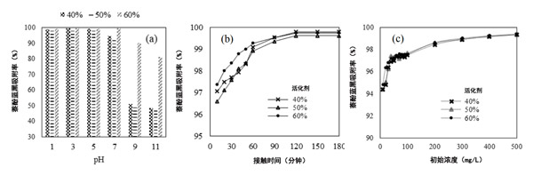 溶液PH影響活性炭的表面電荷。因此,它是控制活性炭吸附過程的重要因素之一。圖2(a)中描述了萘酚藍(lán)黑在以40%,50%和60%的活化劑制備的活性炭上的吸附。在所研究的pH范圍內(nèi)(pH介于1和11之間),萘酚藍(lán)黑在活性炭上的吸附是pH依賴性的,尤其是在pH 5和11之間。在低pH值下,活性炭表面帶有凈正電荷。pH的增加導(dǎo)致凈正電荷的減少和凈負(fù)電荷的增加。萘酚藍(lán)黑是具有負(fù)電荷的陰離子染料。在pH值為3時(shí),它會(huì)在活性炭表面的活性位點(diǎn)(即,官能團(tuán))與被吸附物分子(即,萘酚藍(lán)黑)之間引起靜電吸引。活性炭的活性部位與萘酚藍(lán)黑色分子之間的靜電排斥作用占主導(dǎo)。因此,可以得出結(jié)論,將萘酚藍(lán)黑色吸附到活性炭上的pH值選擇為3。另一方面,使用60%活化劑的活性炭吸附時(shí),萘酚藍(lán)黑的吸附量比使用40%活化劑活化的活性炭吸附的高,這是由于活性炭產(chǎn)生了更多的孔,盡管在pH 1-3下差異不明顯。