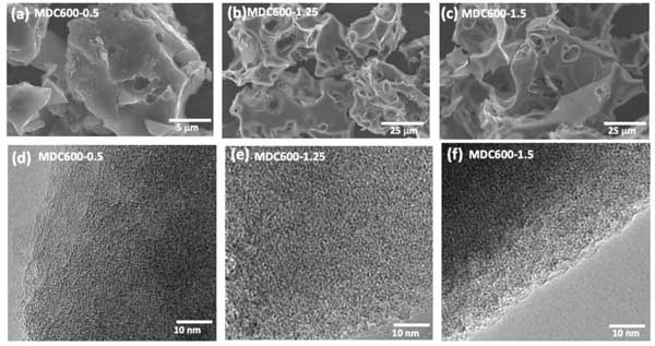 活性炭吸附劑是通過兩步熱解過程制備的,該過程包括將奶粉轉(zhuǎn)化為生物炭,然后在高溫下用堿活化。同時還增加了細微的差別,即涉及一種輔助化學(xué)或物理試劑,可在材料上蝕刻出納米級的孔隙。牛奶由多種蛋白質(zhì),脂肪和礦物質(zhì)組成。有特別地酪蛋白蛋白(一種磷酸蛋白家族)以膠束的形式存在于牛奶中,通過疏水相互作用,氫鍵結(jié)合以及膠束核心內(nèi)磷酸鈣納米簇的橋接而在內(nèi)部得到穩(wěn)定。圖1正是這些磷酸鈣-酪蛋白蛋白簇充當碳的3D結(jié)構(gòu)發(fā)展的模板,因為它們在熱解的初始階段得以保存,在此階段奶粉被加熱到400°C,并防止活性炭內(nèi)結(jié)構(gòu)塌陷。在第二個活化步驟中,堿KOH與碳反應(yīng)生成碳酸鉀,碳酸鉀分解并留下富氮和富氧的微孔。所得的活性炭顯示出有效且可逆地捕集二氧化碳,同時排除了水蒸氣。