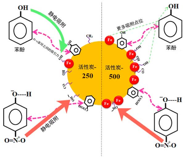 圖1:通過(guò)氫鍵和π-π相互作用將酚類吸附到活性炭上的機(jī)理。