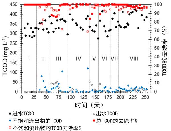 圖2:進(jìn)水中不飽和廢水和總廢水中總化學(xué)需氧量的濃度以及兩種廢水中的去除百分率隨活性炭運行時間的變化(d)。