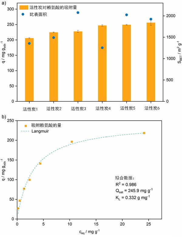 圖1:a、使用具有相應表面積的市售活性炭吸附的賴氨酸量。誤差線對應于從三次重復實驗確定的標準偏差。b、賴氨酸在Langmuir吸附等溫線模型上的吸附等溫線。