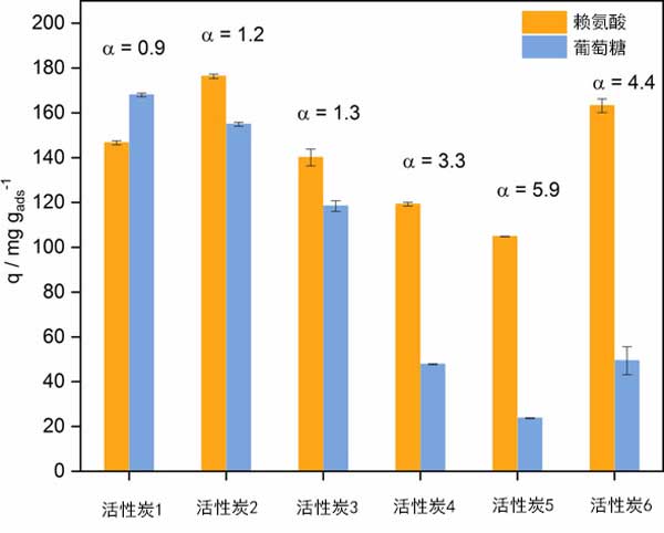 在單組分吸附中,極性最低的賴氨酸(在pH10時)的解離狀態(tài)適合在疏水性活性炭上的吸附。出人意料的是,競爭性吸附表明,親水性更高的活性炭(由較高的氧表面基團含量引起)導致對賴氨酸吸附的選擇性更高。我們建議,葡萄糖(在pH10時不帶電)吸附主要依賴于基于較弱范德華力和疏水相互作用的物理吸附。由于葡萄糖和賴氨酸的極性相似,因此無法針對低功能化碳進行基于物理吸附的分離。相反,氧官能團含量的增加使得賴氨酸的胺基團與活性炭的氧表面基團之間的靜電相互作用和氫鍵增強,從而與葡萄糖相比對賴氨酸具有更高的選擇性。為了進一步了解賴氨酸-葡萄糖吸附對賴氨酸的高選擇性的起源并增強吸附性能,對活性炭進行了系統(tǒng)地改性,以適應表面化學性質(zhì)。