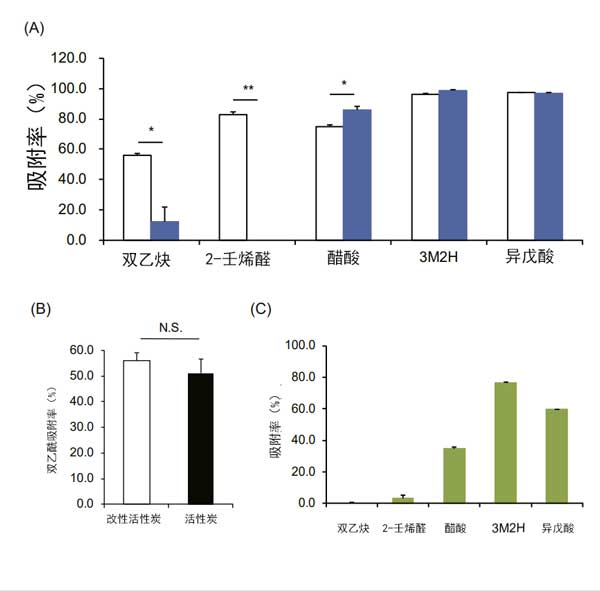 我們測(cè)試了活性炭對(duì)五種散發(fā)惡臭的揮發(fā)性有機(jī)化合物的吸附能力。發(fā)現(xiàn)活性炭對(duì)二乙;2-壬烯醛的吸附水平均高于氧化鋅。但是,與醋酸氧化鋅相比,活性炭的吸附效果略低(圖3A)。相反,活性炭和氧化鋅對(duì)3M2H和異戊酸的吸附能力之間沒有顯著差異。為了比較活性炭和改性活性炭中所含活性炭的吸附能力,使用無法吸附在二氧化鈦上的二乙酰基測(cè)試了相同量活性炭中的吸附水平。發(fā)現(xiàn)與活性炭相比,改性活性炭的吸附能力沒有顯著變化(圖3B)。