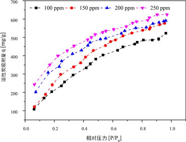 為了確定三氯乙烯初始濃度在進(jìn)料流中的影響,研究了100、150、200和250ppm的濃度。維持其他實(shí)驗(yàn)條件,活性炭顆粒大小為355μm,床溫為30°C,活性炭重量為50mg。入口濃度為100、150、200和250ppm時(shí)的吸附容量分別為523.252、575.844、593.181和624.044mg/g。隨著入口三氯乙烯濃度的增加,在壓力增加的情況下,活性炭的吸附容量顯示出穩(wěn)定的增加。在較高濃度下,隨著壓力的增加,吸附容量的增加可能是由于相鄰分子與微孔中的層內(nèi)分子粘附所致。這導(dǎo)致形成粘附在吸附劑表面上的層內(nèi)分子的相鄰三氯乙烯分子堆疊。三氯乙烯分子的平面形狀的動(dòng)力學(xué)直徑為6.6。因此,它會(huì)積聚在活性炭的微孔/中孔上。在活性炭的微孔區(qū)域中具有大孔體積的情況下,假設(shè)縫隙形狀的孔幾何形狀,則期望對(duì)活性炭上的三氯乙烯具有高親和力。在低濃度(0-8000μg/L)的活性炭上進(jìn)行了三氯乙烯的吸附,在室溫下吸附量為160mg/g。