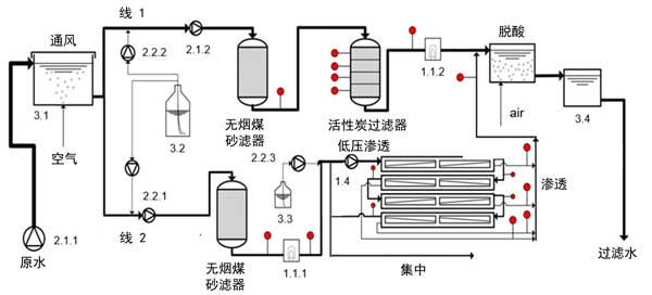 半技術試驗工廠安裝了電氣安裝,工廠控制和數(shù)據(jù)管理。中試工廠由兩條處理線活性炭和反滲透膜(參見圖1)組成,具有17個采樣點。充氣后的原水通過增壓泵2.1.1和2.1.2從儲水箱(3.1)連續(xù)泵出。將痕量有機污染物(3.2)注入標有2.2.1和2.2.2的泵的吸入側,以確保適當?shù)臎_洗混合和良好的分散性。加水后的水以平行模式通過無煙煤砂濾池以及隨后的活性炭(線1)和反滲透膜(線2)。每月對粒子過濾器進行反沖洗。為了測試紫外線消毒在反滲透膜之前作為減少生物結垢的附加預處理步驟的效果,在活性炭砂濾池的下游操作了紫外線裝置(1.1.1)。反滲透膜管線的進料通過兩個濾筒過濾器進行預處理,兩個濾筒過濾器依次安裝了80和5μm的標稱截止值。