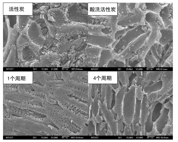 通過酸洗的活性炭和活性炭在顯示圖2中,SEM成像還透露,酸洗除去的雜質(zhì),從而產(chǎn)生的孔結(jié)構(gòu)具有一個(gè)看似光滑的表面。與原始活性炭相比,酸洗活性炭的比表面積和總孔體積略大。這可能是在酸洗過程中去除了其他化學(xué)物質(zhì)(例如氧氣)的影響。然而,酸洗似乎對活性炭的孔徑幾乎沒有影響。原始活性炭和新鮮活性炭的平均孔徑表明,絕大多數(shù)孔都屬于微孔范圍。