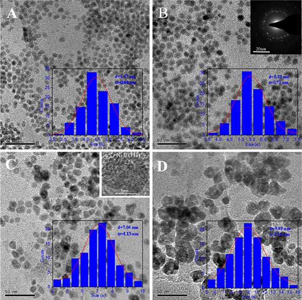 活性炭中鎳的透射電子顯微照片(圖1的A-d),納米粒子為球形且均勻地分布,這表明金屬磷化物納米顆粒的相對(duì)尺寸和分散度的化學(xué)反應(yīng)過程中合成。在催化劑合成過程中,油胺起還原劑的作用,從而控制成核速率。同時(shí),三辛基膦用作磷源和穩(wěn)定劑,通過Ni(0)表面的配位提供可調(diào)的表面穩(wěn)定性。在合成中,對(duì)于少量三辛基膦,發(fā)生Ni(II)前體的快速還原,導(dǎo)致Ni(0)物質(zhì)的重要濃度,其不能被溶液中存在的配體有效穩(wěn)定。然后,快速聚集過程的結(jié)果形成大尺寸的磷化鎳納米顆粒在活性炭載鎳催化劑。然而,當(dāng)油胺的量減少時(shí),制備少量核,并且大量三辛基膦的存在抑制它們的生長(zhǎng),導(dǎo)致形成小的納米顆粒。此外,所選擇的區(qū)域的電子衍射和晶格條紋的圖像(在所示圖1 B,C)表明,球形磷化鎳納米粒是單晶。因此,它的尺寸大于Ni 2通過改變油胺和三辛基膦的濃度可以很容易地調(diào)節(jié)活性炭催化劑,這提供了一種精確控制其尺寸在4到10nm范圍內(nèi)的方法,在這些方法中,這些磷化鎳納米顆粒在活性炭上以各種尺寸負(fù)載將具有不同的屬性可能導(dǎo)致不同的反應(yīng)性。