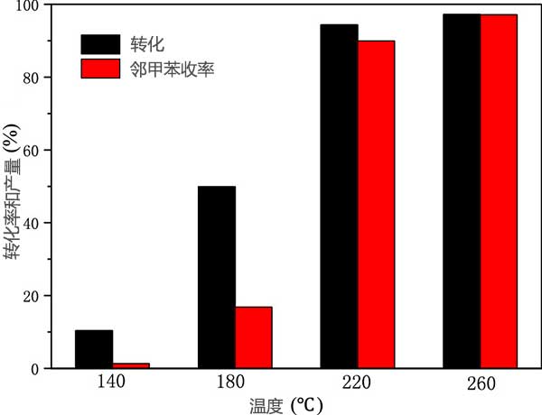 為了評(píng)價(jià)制備的磷化鎳活性炭的有用性,進(jìn)行對(duì)生物油模型化合物加氫脫氧的活性。在測(cè)試中,我們使用SA(水楊醛)作為熱解油的代表性組分來探索加氫脫氧途徑。在這項(xiàng)工作中,SA轉(zhuǎn)化為鄰甲酚可以通過路徑氫化/氫解或C=O鍵的直接氫解進(jìn)行。圖2顯示了加氫脫氧相對(duì)于鎳的轉(zhuǎn)化率和產(chǎn)率活性炭受反應(yīng)溫度影響。結(jié)果表明,隨著反應(yīng)溫度的升高,SA的轉(zhuǎn)化率和鄰甲酚的收率逐漸增加。當(dāng)反應(yīng)溫度為260℃時(shí),鄰甲酚目標(biāo)產(chǎn)物的產(chǎn)率較大,2小時(shí)達(dá)到97.1%,這表明反應(yīng)溫度顯著提高了它的區(qū)域選擇性加氫脫氧的催化活性。