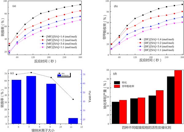 盡管碳水化合物衍生的化合物在加氫脫氧過程中對(duì)芳族化合物有影響,但是之前的一些熱解油升級(jí)的研究集中在加氫脫氧反應(yīng)中碳水化合物衍生的化合物和木質(zhì)素衍生的芳族化合物之間的相互作用。在這次研究中,用活性炭催化從酚級(jí)分(SA)產(chǎn)生的碳水化合物衍生物的(MF)的加氫脫氧的熱解油的效果進(jìn)行了研究(在圖3所示)。MF的存在對(duì)SA的轉(zhuǎn)化和鄰甲酚的收率產(chǎn)生了很大的影響。在不存在MF的情況下,SA的轉(zhuǎn)化率為99%,持續(xù)180分鐘,相應(yīng)的鄰甲酚產(chǎn)率為97%。隨著反應(yīng)物中MF比例的增加,SA轉(zhuǎn)化率和鄰甲酚產(chǎn)率均顯著降低。當(dāng)(MF)/(SA)值為1.00(mol / mol)時(shí),SA的轉(zhuǎn)化率和鄰甲酚的收率分別從99%和97%急劇下降至70%和60%,這表明通過在反應(yīng)物中存在MF,抑制了SA的反應(yīng)性。