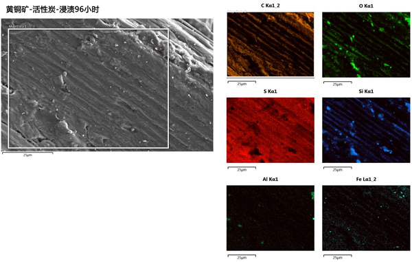 選擇在48和96小時浸出后獲得的固體樣品進行后續(xù)表征。由于硫化物硫氧化成元素硫,形成的新物質(zhì)是硫。需要注意的是,添加活性炭和未添加碳的浸出殘渣中的硫含活性炭催化劑從硫化銅中浸出金屬量存在很大差異。浸出殘渣黃銅礦在96小時的SEM-EDS顯微照片顯示硫吸附在活性炭的表面(圖2)。這種現(xiàn)象可以在活性炭催化的黃銅礦浸出機理中發(fā)揮重要作用,抑制其表面硫鈍化層的形成,從而提高該過程的動力學。碳材料對元素硫的吸附可以簡化從浸出渣中去除硫的過程,從而減少最終礦山廢物對環(huán)境的影響。