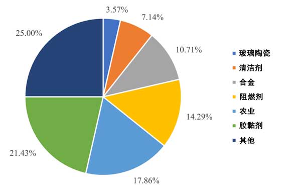 硼是自然界七大必需微量元素之一,少量的硼攝入有利于植物細(xì)胞膜保持其結(jié)構(gòu)和功能的完整性,并維持正常的發(fā)育和物質(zhì)運(yùn)輸。硼不僅是生物體必需的微量元素,也是許多工業(yè)的重要原料,如制造業(yè)和農(nóng)業(yè)。根據(jù)近期的統(tǒng)計(jì)數(shù)據(jù),僅硼酸鹽就有300多種應(yīng)用,全球四分之三以上的硼消耗量來(lái)自陶瓷、洗滌劑、化肥和玻璃(圖2)。在生產(chǎn)過(guò)程中,硼酸鹽是制造各種特殊玻璃和陶瓷的主要成分。在高級(jí)玻璃和玻璃纖維的生產(chǎn)中使用硼硅酸鹽可以提高玻璃的耐熱性和透明度,有利于提高其化學(xué)穩(wěn)定性以及抗機(jī)械和熱沖擊的能力。在瓷釉中加入硼可以防止脫釉和開(kāi)裂,提高產(chǎn)品的光澤度和耐久性。在瓷體中加入硼酸鹽有利于降低能耗,提高產(chǎn)品的機(jī)械強(qiáng)度。硼還用于生產(chǎn)微合金鍛鋼并提高鋼的沖擊強(qiáng)度。在農(nóng)業(yè)領(lǐng)域,硼被用于生產(chǎn)含硼化肥等產(chǎn)品。但是灌溉水中的硼含量升高會(huì)直接導(dǎo)致動(dòng)植物中毒造成危害,所以一定要控制排放。