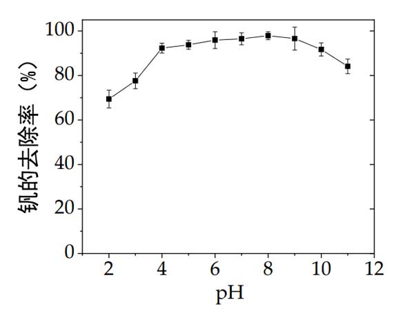 圖1:pH值對活性炭載納米零價鐵上釩的吸附。