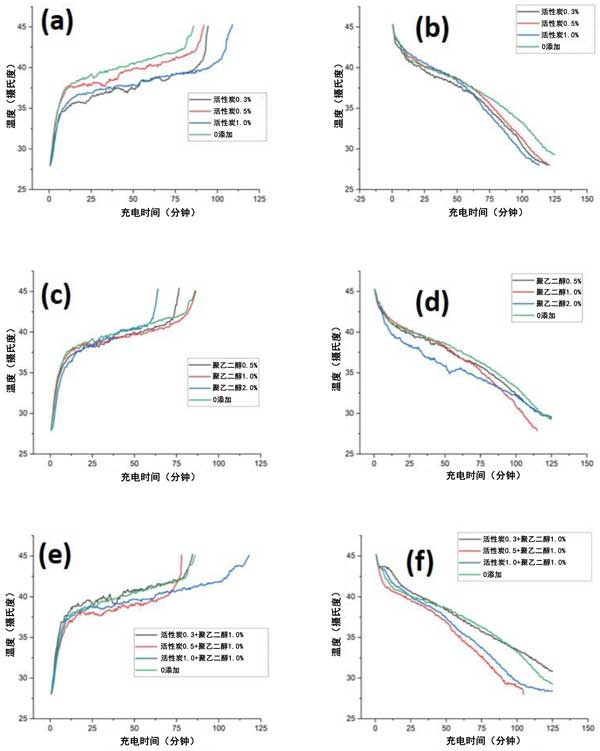 圖3:(a,b)活性炭0.3%,0.5%,1%,(c,d)聚乙二醇0.5%,1%,2%,(e)不同重量比的變相材料充放電倍率,(f)活性炭為0.3%、0.5%和1%,聚乙二醇為1%。