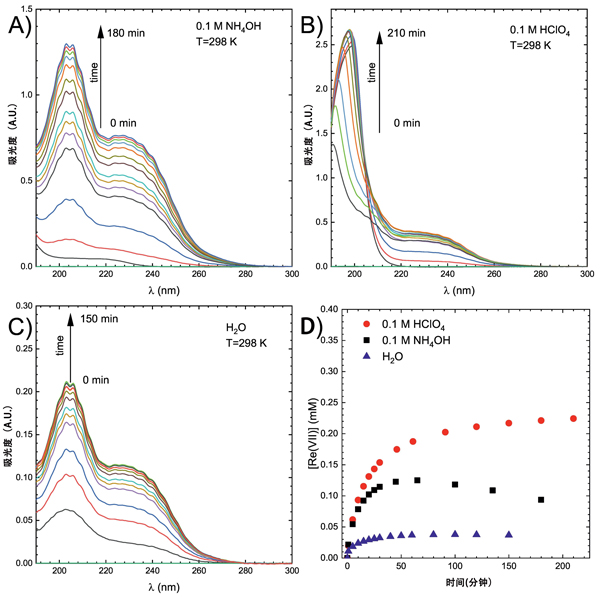 圖4:A在0.1M/HClO4,B在0.1M/NH4OH,C在H2O中解吸過程中獲得的UV-Vis曲線。D不同溶液中解吸過程的動力學(xué)曲線。