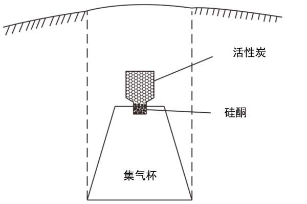 所用儀器為活性炭氡檢測(cè)儀。在現(xiàn)場調(diào)查中,將使用過的活性炭烘烤干燥。冷卻后,將活性炭按照適當(dāng)?shù)臉?biāo)準(zhǔn)放入取樣器中,用硅膠塞規(guī)避地下水分的影響,然后將樣品密封備用。接下來,將裝滿的采樣器口朝下放置在測(cè)試坑中,如圖1所示。采樣器和集氣杯穩(wěn)定固定,上面蓋上塑料布,密封坑口。當(dāng)埋杯到預(yù)設(shè)時(shí)間(至少5天)時(shí),取出采樣器,仔細(xì)填寫采樣時(shí)間和氣候。然后將采樣器放入經(jīng)過測(cè)試和校準(zhǔn)的活性炭氡氣檢測(cè)儀中,記錄每個(gè)采樣器的線數(shù)和點(diǎn)數(shù)。