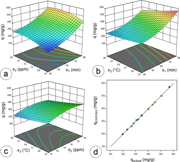 圖3:3D響應(yīng)曲面圖說明了雙自變量的綜合影響(a)接觸持續(xù)時間與入口濃度(x1—x2)、(b)接觸持續(xù)時間與溫度(x1—x3)和(c)入口濃度與溫度(x2—x3)和(d)比較苯吸附的實際吸附容量(q)和預(yù)測吸附容量(q)的圖。